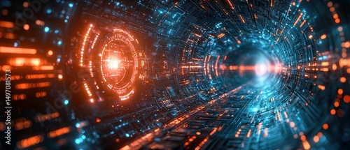 tunnel, digital, futuristic, science fiction, neon, circuit, light, technology, abstract, datum, network, glowing, energy, travel, speed, innovation, progress, modern, electric, virtual, reality, space, cosmic, electronic, computer, science, fantasy, illustration, graphic, design, artistic, visual, rendering, three-dimensional, artwork, orange, blue, dark, line, pattern