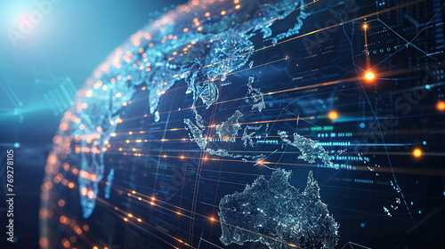 Digital world globe, concept of global network and connectivity on Earth, high speed data transfer and cyber technology, information exchange and international telecommunication. Business map