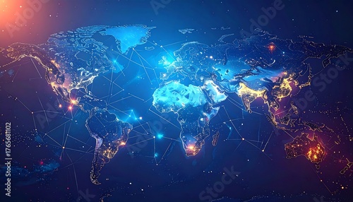 Digital world map with glowing lights, connecting lines, and blue hues, creating a futuristic network concept