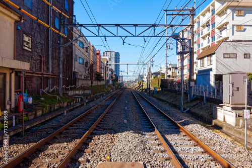 Diminishing perspective of railway tracks at Araiyakushi-mae Station at Japanese City of Tokyo with cityscape on a sunny winter day. Photo taken January 27th, 2024, Tokyo, Japan.