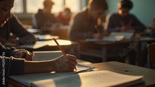 classroom, student, dawn, morning, light, desk, textbook, notebook, writing, study, learning, education, school, tranquil, peaceful, attentive, focused, soft light, neat, tidy, book, paper, note, scribbling, diligent, serious, early morning, sunlight, academic, crayons, paper, note, desk