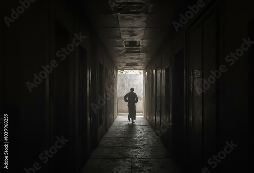 dimly, lit, corridor, silhouette, end, hallway, shadow, lighting, space, dark, interior, pathway