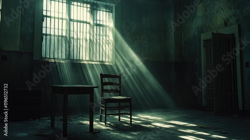 Dimly lit jail cell interior with a solitary chair, table, and light streaming through barred windows