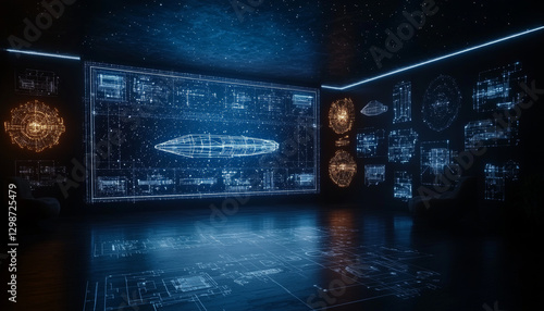 auto, desk, cad, spaceship, blueprint, projection, dimly, lit, room, futuristic, technology, design, engineering, hologram, digital, innovation, science fiction, interior, architecture, concept, visualisation, display, glowing, high technology, creative, modern, advanced, schematic, virtual, interactive, detailed, planning, technical, blueprint, space