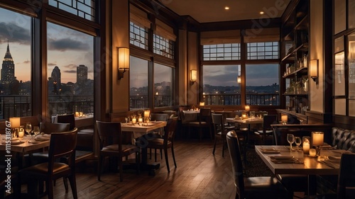 dining room in a restaurant with a night atmosphere, a restaurant with candle interior on each table, and a cinematic urban view, generative ai
