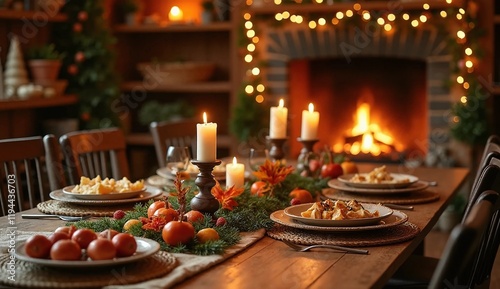 Dinner table decoration for a seasonal festival celebration or romantic dinner in a rustic style. Traditional food, candles, decorative lights and a fireplace add to the warm and romantic atmosphere