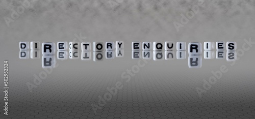 directory enquiries word or concept represented by black and white letter cubes on a grey horizon background stretching to infinity