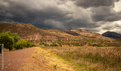 Dirt road with nearby trees and dark rain clouds, distant mountains Cusco, Peru.