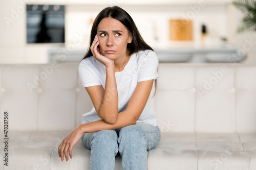 Disappointed unhappy caucasian young woman, sitting on the sofa in the living room, she has personal problems, failure at work, depression, bad mood, sad girl is lonely at home
