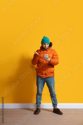 Disappointed. Young caucasian man using smartphone, serfing, chatting, betting. Full length portrait isolated on yellow background. Concept of modern technologies, millennials, social media.