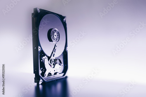 Disassembled hard drive from the computer, hdd with mirror effect. Opened hard drive from the computer hdd with mirror effects. Part of computer pc, laptop