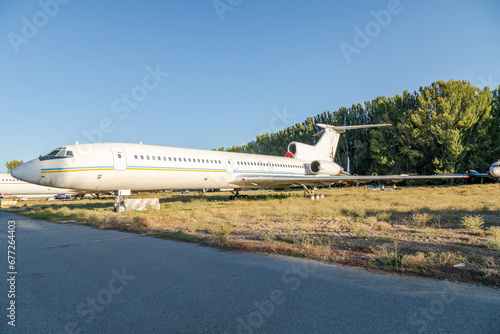 plane, disassemble, broken, engine, technology, landing gear, crashed, maintenance, repair, aerodrome, equipment, wheel, wing, transportation, tree, grass, old, idled