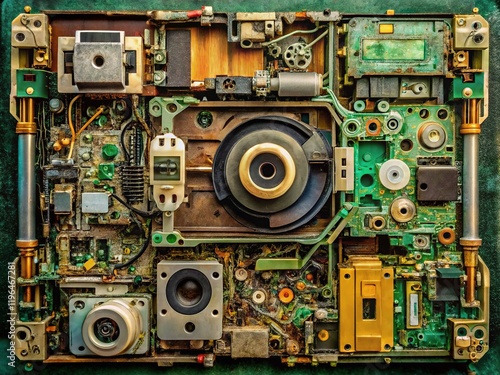 camcorder, disassemble, retro, technology, vintage, electronic, repair, mechanism, obsolete, part, analog, film, tape, mechanical, circuit board, repair shop, 80s, 90s, nostalgia, photo, documentary, still life, closeup, macro, detail, texture, worn, aged, decay, grimy, industrial