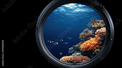 Discover a breathtaking underwater view of coral reefs and tropical fish visible through a round window, basking in soft sunlight