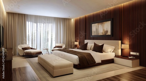 bed, room, bedchamber, furniture, apartment, interior, design, modern, home, decor, wall, house, contemporary, style, floor, white, cosy, comfortable, pillow, three-dimensional, background, luxury, decoration, beautiful, stylish, lamp, nobody, bedding, hotel, window, indoor, living, light, sleep, blanket, wood, space, table, bright, plant, elegant, wooden, minimal, morning, comfort, carpet