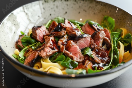 Dish with meat pieces, pasta, greens, sauce from a foie gras and the olive earth