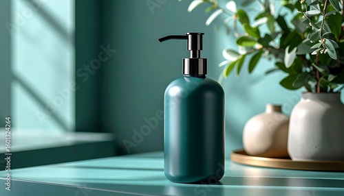 bottle, dispenser, still life, table, standing, modern, design, plant, vase, greenery, indoor, surface, window, leaf, foliage, wall, shadow, tabletop, decoration, element, object, composition, background, nobody, closeup, lifestyle, wellness, decorative, minimalist, clean, presentation, simplicity, refreshing, product, still