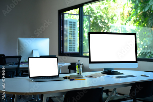 Display laptop and desktop computer with office tools on desk. display screen clipping path