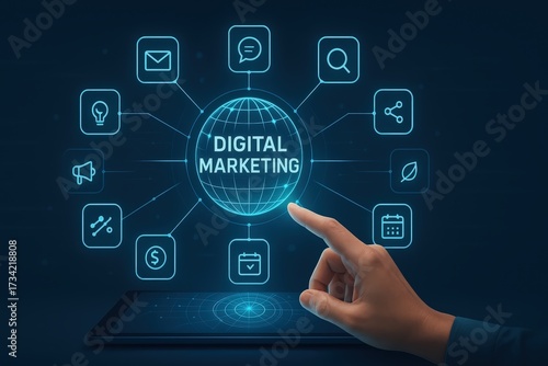 Displaying modern digital marketing concepts, the image presents a hand interacting with a tablet displaying digital marketing icons, symbolizing global connectivity and communication against a...