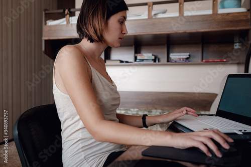 lifestyle, female, computer, home, cyberspace, table, freelancer, freelance, men at work, notebook, house, room, online, student, interior, working, indoor, portrait, person, casual attire, adult, beautiful, job, sitting, professional, desk, modern, work, people, caucasian, young, business, woman, laptop, technology, office