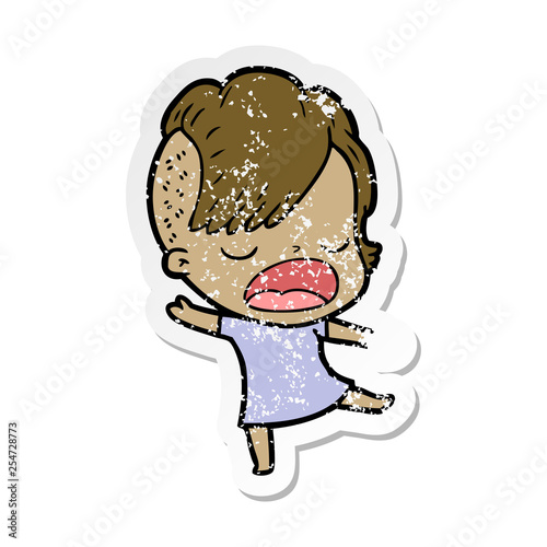 cool, hipster, woman, female, girl, talking, speaking, cartoon, sticker, distressed, grunge, realistic, torn, ripped, old, stick, on, icon, decal, label, drawing, illustration, retro, doodle, freehand, free, hand, drawn, quirky, art, artwork, funny, character