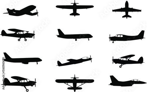 aeroplane, aircraft, jet, biplane, silhouette, black-and-white, aviation, transport, travel, flying, sky, wing, engine, cockpit, tail, landing gear, propeller, jet engine, fighter jet, small plane, graphic design, plane, vector, gun, icon, military, weapon, set, illustration, air, transportation, fly, rifle, flight, collection, army, cross, war, symbol, black