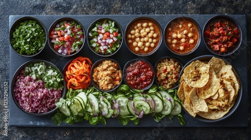 food, meal, healthy, delicious, cookery, snack, vegetarian, vegan, colourful, vibrant, fresh, ingredient, tasty, dinner, lunch, party, buffet, variety, assortment, salad, chickpea, salsa, relish, vegetable, herb, spice, grain, carrot, cucumber, onion, cilantro, chips, nacho, bowl, platter, slate, dark, background, texture, overhead, top, view