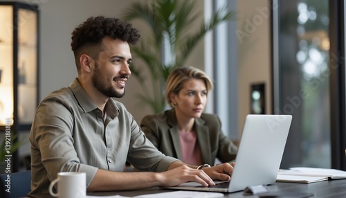 business, office, team, teamwork, collaboration, laptop, technology, working, workplace, meeting, diverse, diversity, man, woman, young, adult, professional, corporate, success, happy, smiling, desk, computer, indoor, interior, modern, contemporary, communication, project, strategy, cooperation
