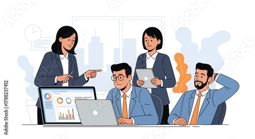 business, meeting, team, collaboration, office, people, work, discussion, analysis, chart, graph, laptop, tablet, presentation, strategy, planning, corporate, professional, diverse, teamwork, brainstorming, datum, report, illustration, modern, vector, employee, success, growth, finance, project