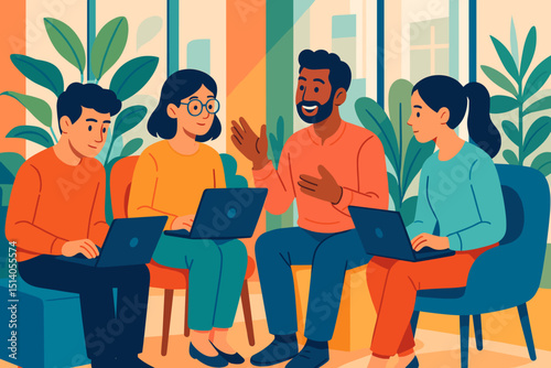 Diverse business team collaborating in modern office. Colleagues brainstorming, discussing ideas with laptops. Teamwork, strategy, innovation, communication. Flat vector illustration.