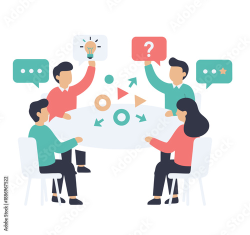 Diverse business team having a brainstorming session at a round table with speech bubbles and idea icons vector illustration.