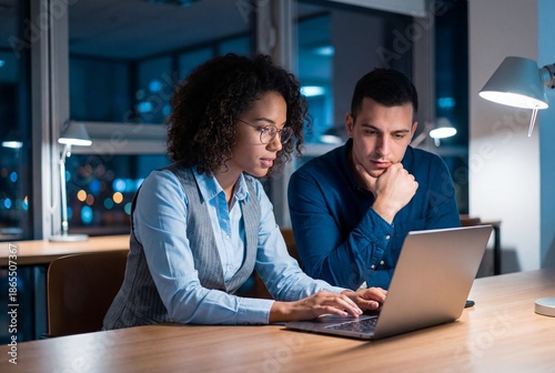 business, office, working, night, overtime, team, laptop, diverse, colleague, computer, collaboration, professional, deadline, corporate, man, woman, workplace, late, project, technology, planning, strategy, desk, lamp, sharpened, job, employee, african, caucasian, serious, partnership, teamwork, cooperation, adult, executive, manager, indoor, window, employment, occupation, sitting, analysing, development, finance, startup, evening, goggles, light
