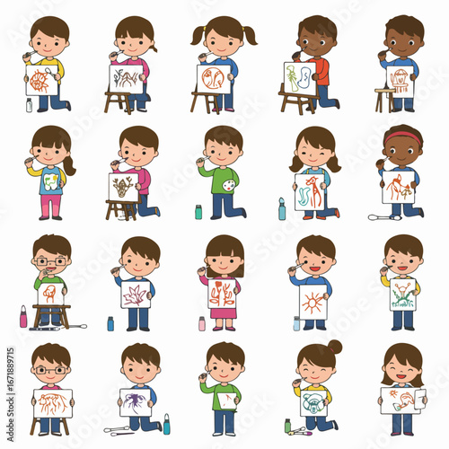 Diverse children happily watering plants, learning about nature and growth in a charming cartoon illustration, promoting gardening, education, and environmental care.