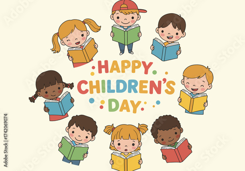 Diverse Children Reading Books for Happy Childrens Day Celebration.