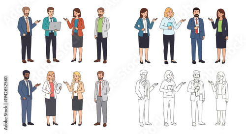 businessperson, professional, diverse, man, woman, standing, interact, discussing, presentation, collaboration, corporate, meeting, teamwork, office, communication, executive, manager, employee, staff, outline, illustration, vector, graphic, people, human, group, collection, modern, confident, successful, smiling, adult, entrepreneur