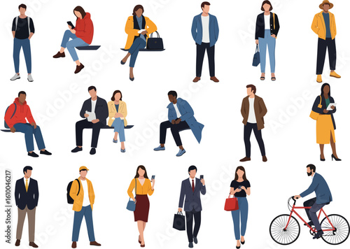 people, group, collection, man, woman, individual, casual attire, clothing, fashion, style, pose, activity, standing, sitting, walking, using, phone, carrying, bag, backpack, bicycle, riding, diverse, modern, young, adult, business, leisure, urban, lifestyle, illustration, vector, flat, design, white, background, isolated, cut-out, full, length, half, variety, community, society