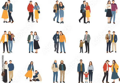 couple, family, people, group, together, standing, sitting, casual attire, clothing, white, background, illustration, vector, art, design, collection, diverse, human relationships, love, friendship, lifestyle, modern, young, adult, children, eltern, woman, man, male, female, human, activity, leisure, social, community, connection, variety, different, scene, composition
