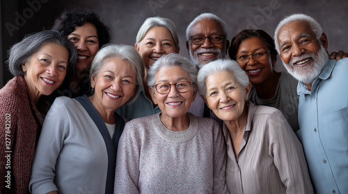 Diverse group of elderly people smiling warmly together