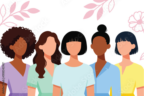Diverse group of five women with different skin tones and hairstyles standing together, adorned with subtle floral patterns in the background, symbolizing women empowerment