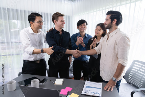 Diverse group of office employee worker shake hand after making agreement on strategic business marketing meeting. Teamwork and positive attitude create productive and supportive workplace. Prudent