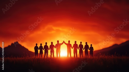 sunset, group, silhouette, oneness, friendship, teamwork, collaboration, nature, outdoors, mountain, landscape, togetherness, connection, horizon, warmth, joy, diversity, peace, celebration, serenity, sky, sunlight, bond, family, love, community, calmness, human, partnership, hope, freedom, appreciation, optimism, equality, emotion, spirit, quiet, identity, engagement, culture, solidarity, beauty