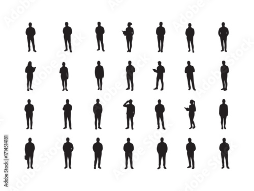 Diverse group of people silhouettes in various poses for architectural or design applications. silhouette