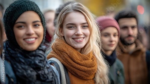 people, diverse, group, smiling, happy, friendly, interaction, community, urban, city, street, together, connection, social, engagement, oneness, multicultural, diversity, inclusion, equality, face, woman, man, young, adult, casual attire, clothing, fashion, warm, positive, respect, tolerance, support, empathy, belonging, friendship, communication, collaboration, togetherness, public