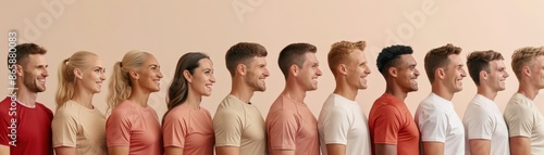 Diverse group of people standing in line, side view. Unity and teamwork concept with mixed-gender and multi-ethnic individuals.