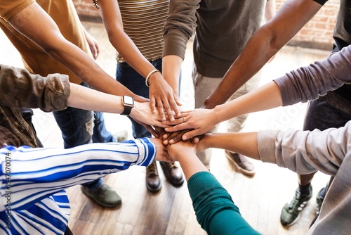 Diverse group of people with hands together in unity. Hands of different ethnicities and genders in a circle. Teamwork and unity shown through hands in a group. Team stacking hands together.