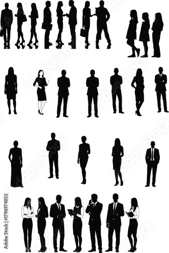 silhouette, people, business, professional, diversity, teamwork, manpower, community, interaction, pose, standing, figure, black-and-white, vector, illustration, group, man, woman, attire, formal, casual attire, communication, conversation, presentation, meeting, collaboration, leadership, organisation, human, design, graphic, clip art, representation, office, corporate, success, achievement