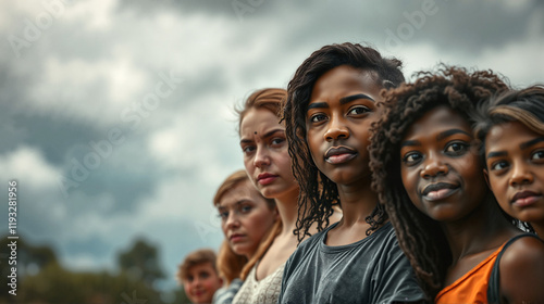 Diverse group of women standing under cloudy sky, international youth day