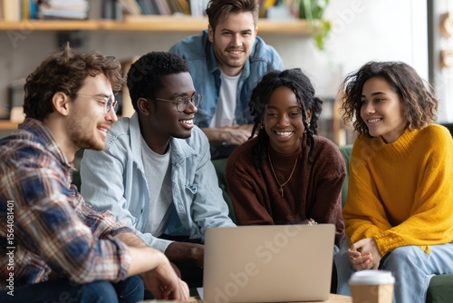 Diverse group of young adults smiling, gathered around a laptop, engaged in a collaborative activity in a casual, bright setting