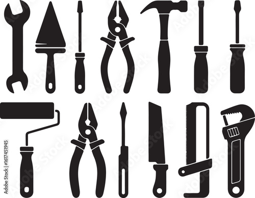 wrench, trowel, screwdriver, plier, hammer, hacksaw, silhouette, black-and-white, illustration, construction, bricolage, repair, tool, equipment, hardware, workshop, manual labor, utility, maintenance, building, home improvement