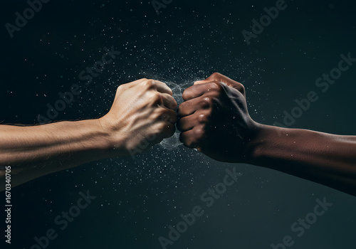 hand, fist, collision, conflict, diversity, people, confrontation, equality, social, justice, light, dark, contrast, impact, particle, gesture, symbolic, illustration, image, photo, studio, closeup, colours, human, skin, black, white, power, resistance, unification, background, editorial, commercial, social issue, oneness